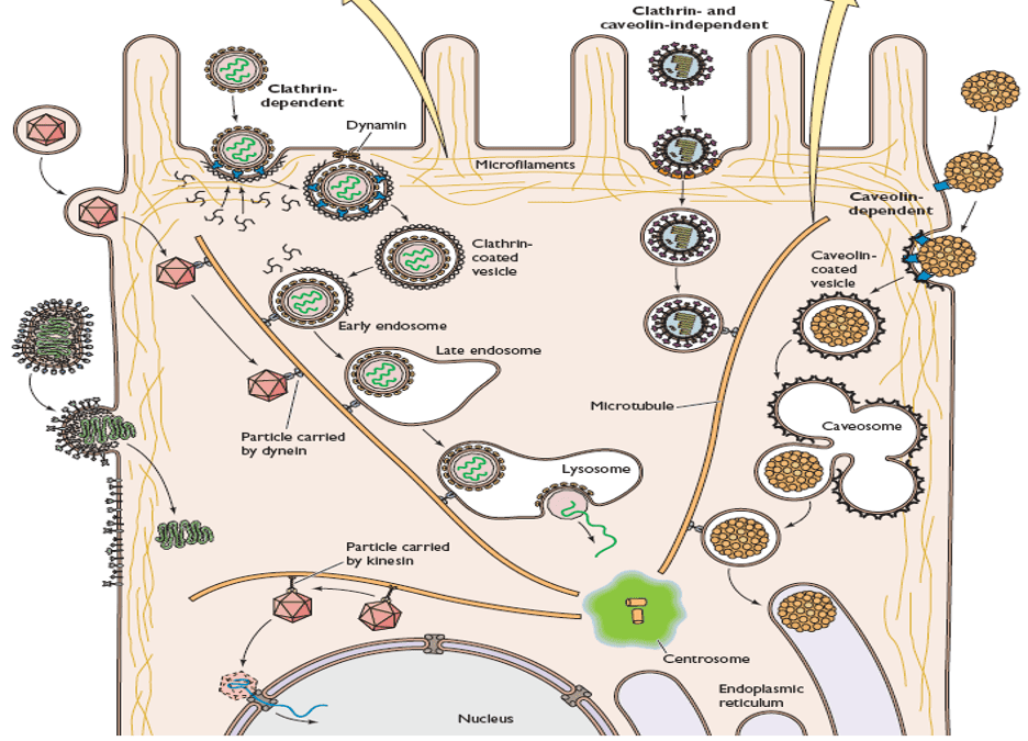 - For viruses that replicate within the cytoplasm, the viral nucleocapsids have to be routed to the positioning for replication. These viruses use microtubule-mediated transport coupled with receptor-mediated endocytosis mechanism for the transport inside the cytoplasm. Clathrin-mediated endocytosis (essentially the most generally noticed uptake pathway for viruses), viruses are transported by way of the early endosome to the late endosome and finally to the lysosome. Within the Caveolin/lipid-raft mediated endocytosis, brings viruses to caveosomes. By the second vesicle transport step, viruses are transported to Golgi, after which to Endoplasmic Reticulum (ER).