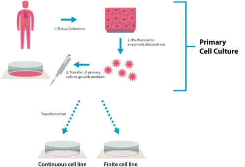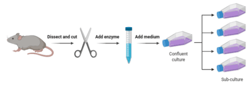 - Tissue fragments are cultured to allow outgrowth of cells.